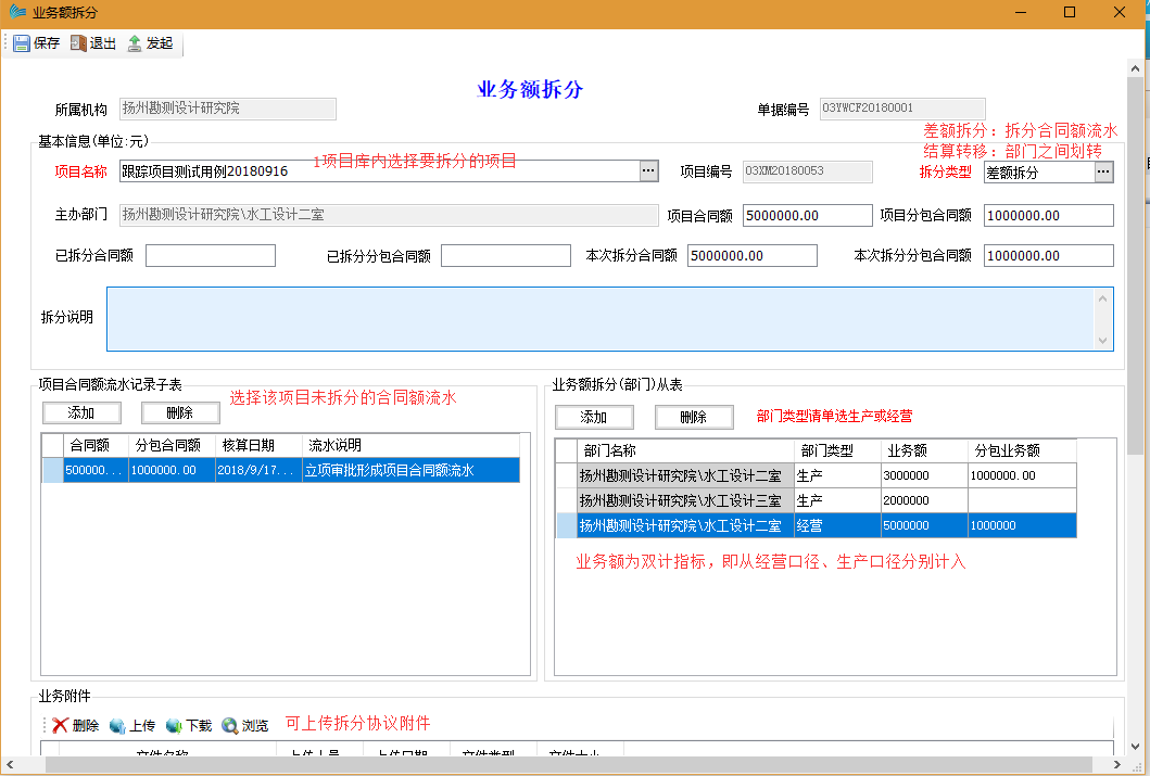 拆分类型:差额拆分是指拆分合同额流水,结算转移是指部门之间划转 差额拆分时,左侧合同额流水等于右侧业务额拆分部门明细。 结算转移时,左侧合同额流水为空,右侧部门列表经营口径合计为0,生产口径合计为0 右侧部门列表中的,经营部门业务额合计一定等于生产部门业务额合计。分包业务额等同。 |
